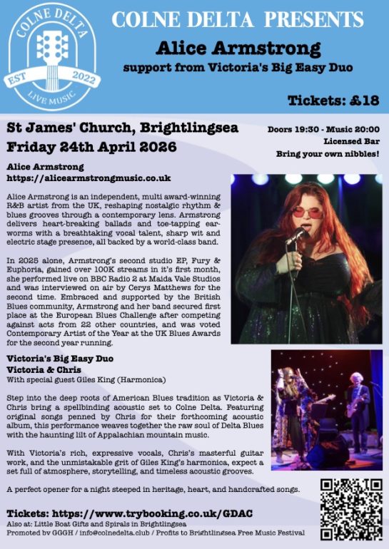 The Colne Delta Blues and Americana brings a range of high quality music to the area. Based in Brightlingsea they present monthly concerts featuring both local, national and international artists from the blues and americana fields. Details of their latest concerts are on the website colnedelta.club or on Facebook or Instagram by searching Colne Delta.